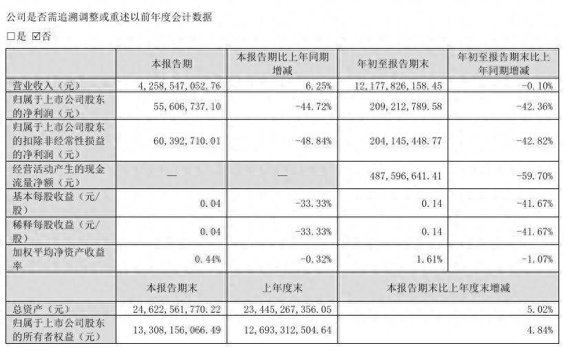 其中第三季度,公司营业收入为42.6亿元,同比上升6.3%;归母净利润为5561万元,同比下降44.7%;扣非归母净利润为6039万元,同比下降48.8%;EPS为0.0375元。