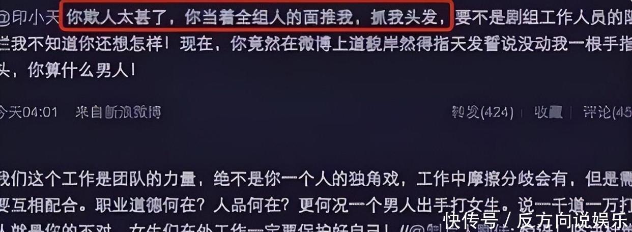 后来导演都让步了,决定不拍吻戏,本以为事情就这么过去了,谁知道边潇潇早就有别的打算——是不是拍不拍戏无所谓,关键是得把戏做到位。拍摄中遇到的意见不合,一到摄影棚外,她就把事情改得面目全非,当场情绪崩溃,怒骂印小天,场面一度弄得挺乱的。那晚,边潇潇的助理知心钰在社交平台上发了一篇很煽动的长文,虽然没有提剧本分歧,但却暗指印小天仗势欺人,不但改剧本耍大牌,还对边潇潇动手打人。