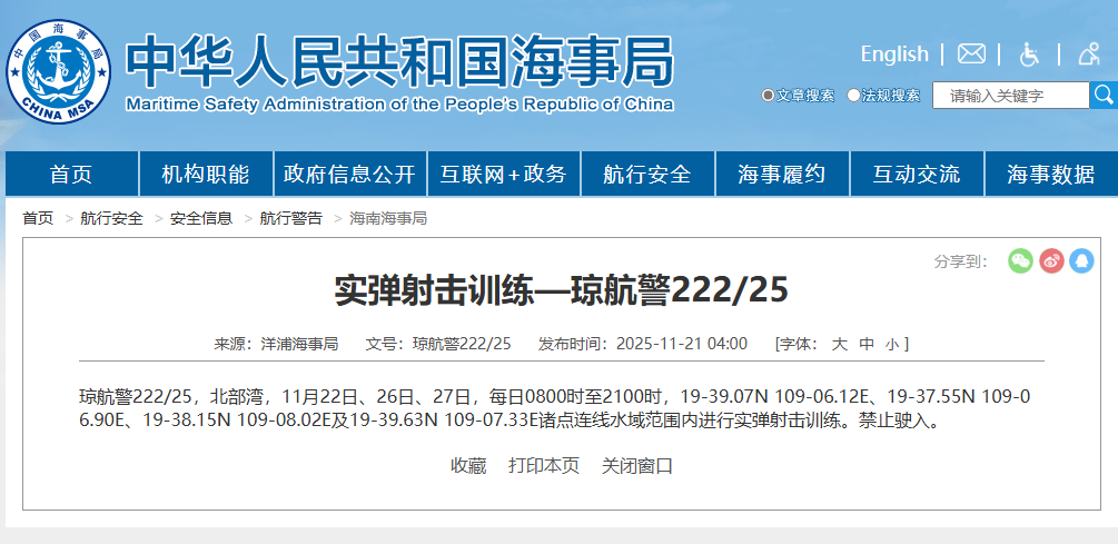 据中国海事局网站消息,洋浦海事局发布航行警告,11月22日、26日、27日,每日8时至21时,北部湾部分水域进行实弹射击训练,禁止驶入。